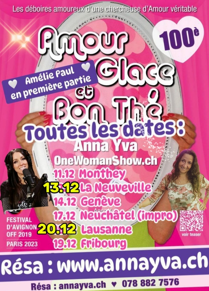 Le One woman pétillant, tout en fraîcheur et en émotions de mon amie Anna YvaAmour, humour style Bridget Jones ! Anna Yva nous invite à rire, réfléchir… et à tomber amoureux de la seule personne qu’on oublie trop souvent : soi-m’aime.