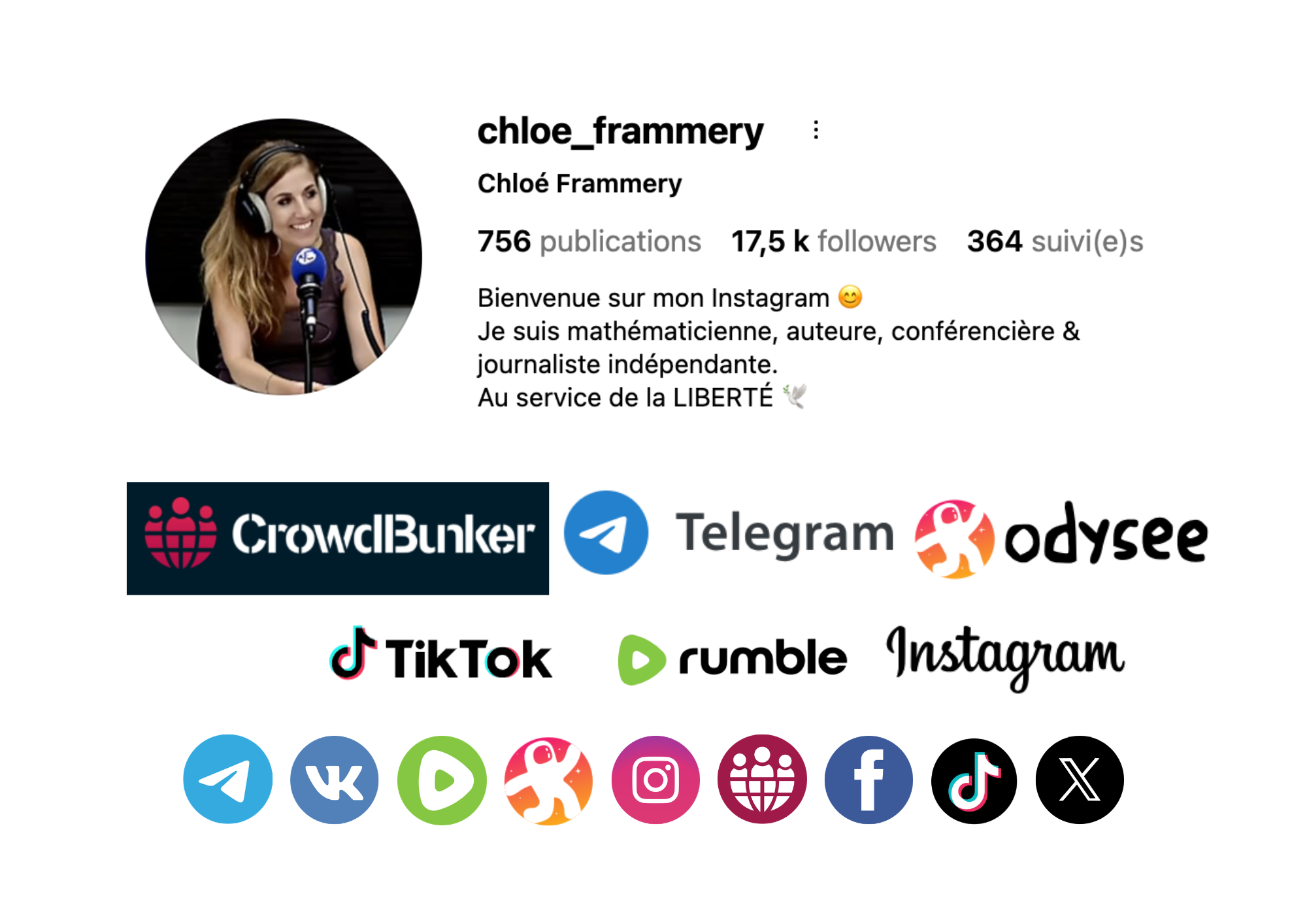 « Chloé Frammery, professeur de mathématiques, journaliste et conférencière, elle est [la fondatrice] du mouvemet LIBERTÉ à Genève, elle dénonce les scandales bancaires et les dérives politiques au détriment du peuple. »