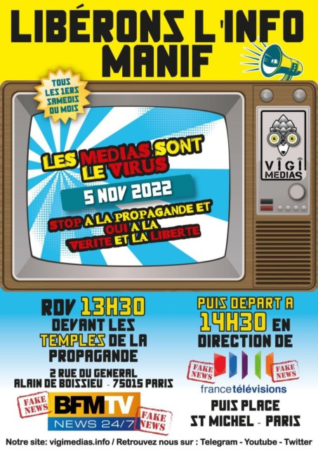 Venez nombreux, à la manif VIGIMEDIAS le samedi 5 novembre 2022 devant BFMTV, le temple de la propagande, RDV à 13h30.