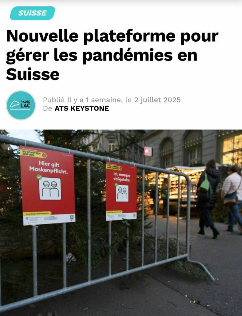 Une dernière chose avant de passer aux autres actus du mois écoulé : début juillet 2025, la Confédération suisse a mis en place une plateforme numérique pour « gérer » les pandémies.