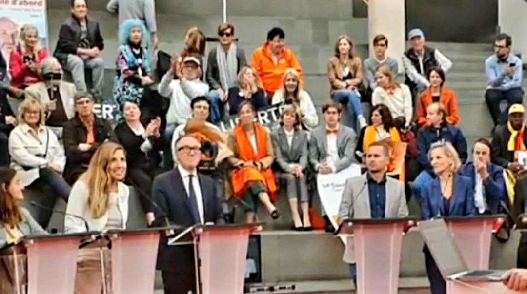- Le jour de l’élection (le 22 oct.), interdiction de se prendre en photo devant l’urne de vote au local de vote (nouveau règlement du Conseil d’état, nous dit-on… Vidéo : https://t.me/chloefinfosofficiel/5843) et à Unimail, lieu d’annonce des résultats, nous avons droit à seulement 2 petites minutes de parole sur Léman bleu en direct (Gérard, mon colistier, n’est même pas invité à prendre la parole), durant lesquelles j’ai juste le temps de glisser le traité « pandémie » de l’OMS, la sexualisation des enfants à l’école, l’Agenda 2030 !