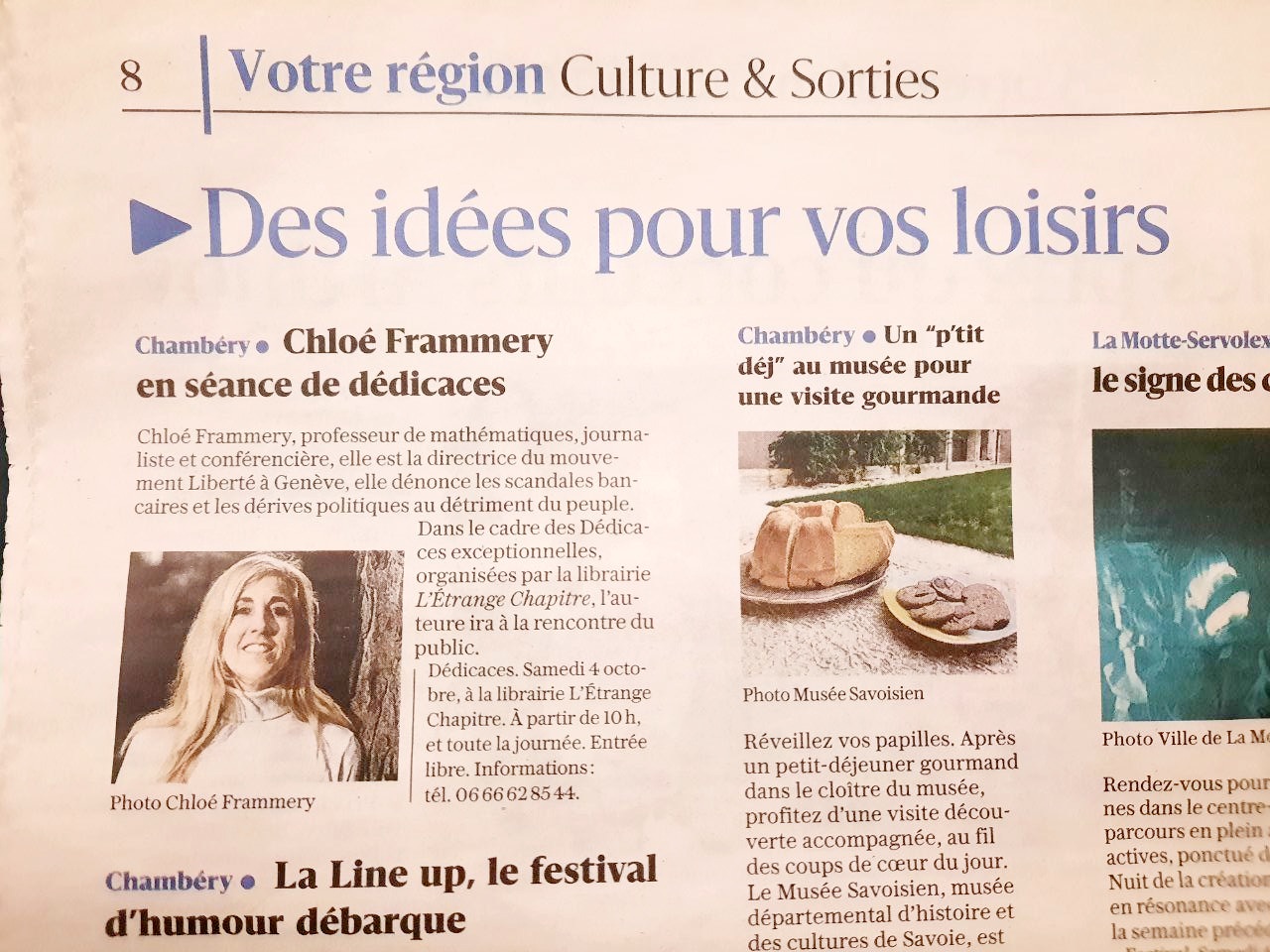 « Chloé Frammery, professeur de mathématiques, journaliste et conférencière, elle est la directrice [la fondatrice] du mouvemet LIBERTÉ à Genève, elle dénonce les scandales bancaires et les dérives politiques au détriment du peuple. »